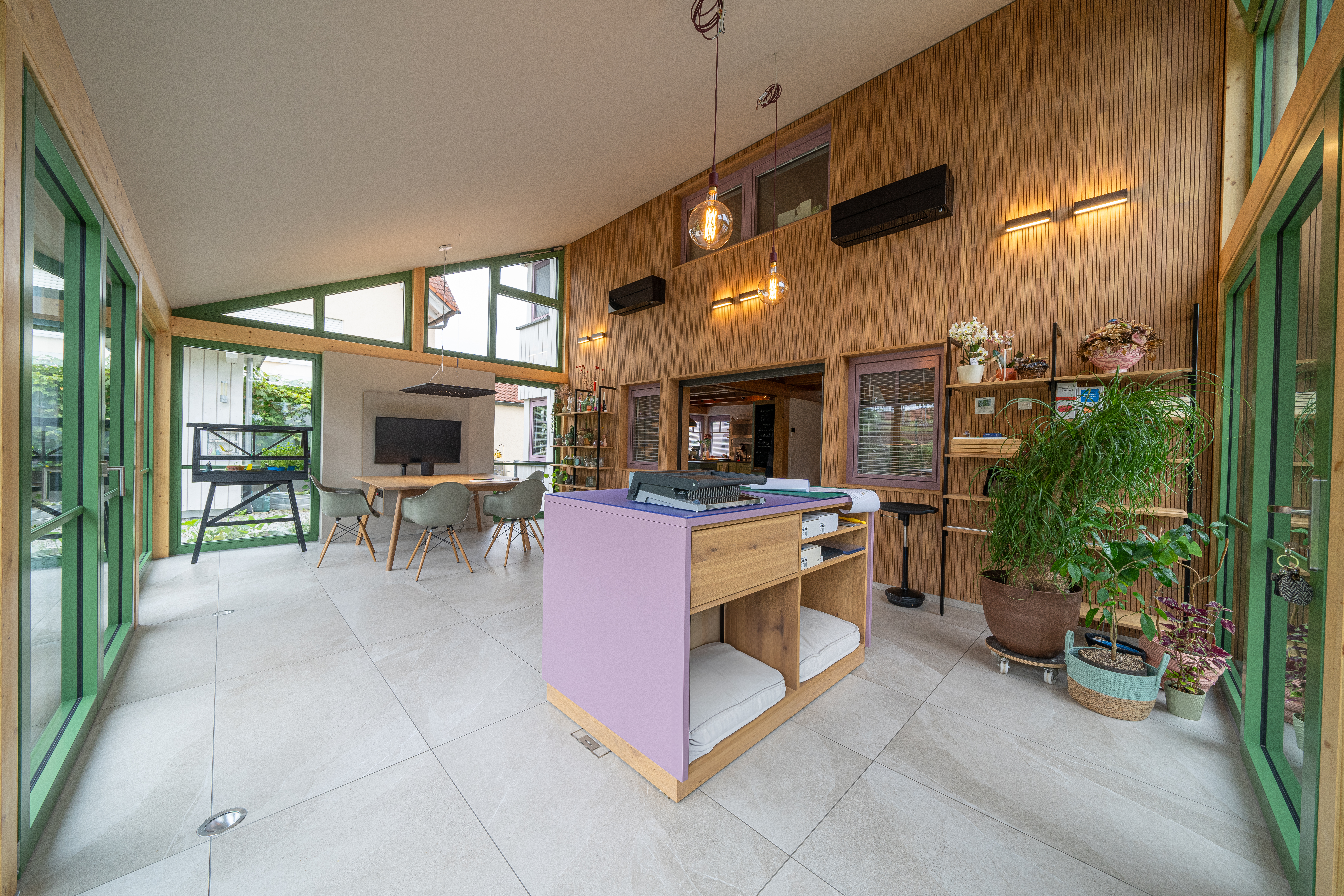 Der gesamte Ausbau erfolgte mit viel Liebe zum Detail und einem hohen Anspruch an Materialqualität und Ausführung. Der Anbau zeigt, wie durch eine durchdachte Planung ein moderner, nachhaltiger Arbeitsbereich entstehen kann, der sowohl funktional überzeugt als auch gestalterisch zum Gesamtgebäude passt.