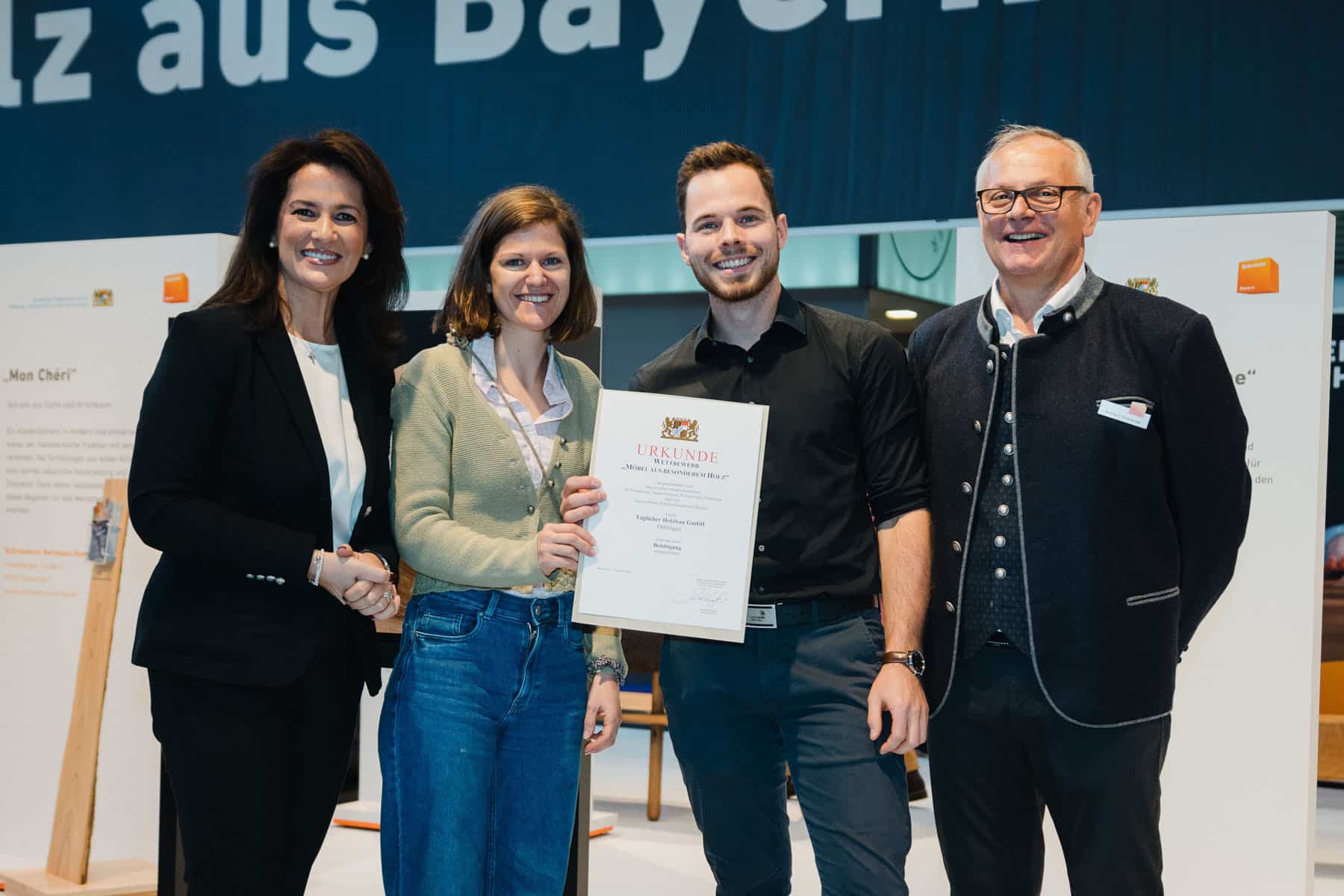 Für dieses gelungene Projekt erhielt Taglieber eine Belobigung. Forstministerin Michaela Kaniber sowie Bernhard Daxenberger, Präsident des Fachverbands Schreinerhandwerk Bayern, gratulierten dem Team persönlich am Messestand.